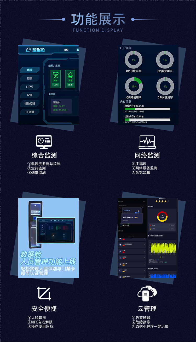 數(shù)據(jù)艙采用了嚴(yán)格的動環(huán)監(jiān)控系統(tǒng),包括煙霧監(jiān)控、溫濕度監(jiān)控、空調(diào)監(jiān)控、視頻監(jiān)控(選配)等,24小時保護(hù)IT設(shè)備安全。