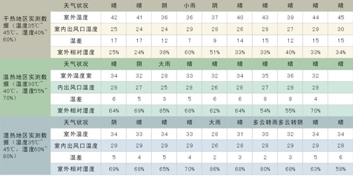 冷風(fēng)機(又叫環(huán)保空調(diào)或者水空調(diào))降溫原理是:當風(fēng)機運行時進入腔內(nèi)產(chǎn)生負壓,使機外空氣流過多孔濕潤的濕簾表面迫使過簾空氣的干球溫度降至接近于機外空氣的濕球溫度,即冷風(fēng)機出口的干球溫度比室外干球溫度低5-12℃(干熱地區(qū)可達15℃),空氣愈干熱,其溫差愈大,降溫效果越好。由于空氣始終是從室外引進室內(nèi),(這時候叫正壓系統(tǒng))所以能保持室內(nèi)空氣的新鮮;這樣子說起來大家還是沒有直觀的認識和了解,凱美恒特意制作了在不同條件下冷風(fēng)機的降溫效果數(shù)據(jù)表如下: